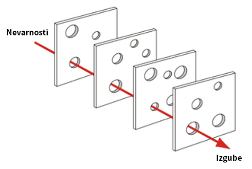 Pomembno je, da se v organizaciji zavedate tudi tega, da noben ukrep za zmanjševanje tveganj ni popolnoma vsemogočen. Vedno obstajajo načini, da gre narobe nekaj, česar ni nihče uspel predvideti; slednje pa potrjujejo tudi vse večje nesreče, ki jih je kadarkoli povzročil človek. Zato o ublažitvenih ukrepih razmišljajte kot o plasteh švicarskega sira, ki nas branijo pred končno izgubo. Vsaka izmed plasti tveganje na nek način ublaži, a niti ena izmed njih ni popolna.